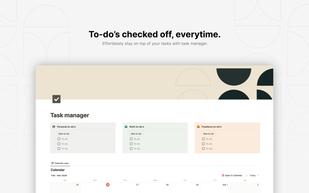 A simple, yet functional task manager built in Notion with the ability to organize your to-do's from multiple different sources. Use the calendar view below to add deadlines to tasks.